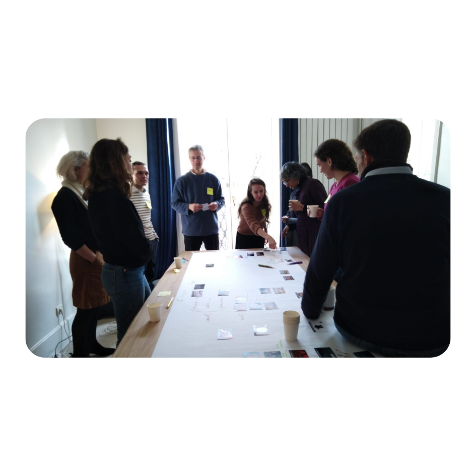 Une équipe de 4 à 8 personnes positionnent les cartes pour créer leur Fresque de la Justice.